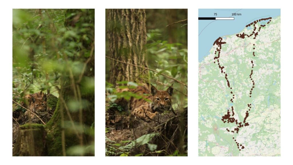 Po okresie adaptacji w Dzikiej Zagrodzie został wypuszczony na wolność. Wtedy zwykle – jak w większości takich historii – kontakt wizualny się kończy. Lecz dzięki telemetrii zaczęliśmy obserwować jego losy. Lupek rozpoczął nadzwyczaj przygodowe życie. Ku naszemu zdziwieniu okazało się, że podjął wędrówkę na północ, aż nad Bałtyk! Spotkaliście kiedyś rysia na plaży? Miejcie oczy otwarte, bo Lupek udowodnił, że to możliwe! I w dodatku wybierał się tam dwukrotnie. Pierwszy raz wiosną 2024 roku – zawędrował nad jezioro Kopań i doszedł aż do Jarosławca. Ze względów bezpieczeństwa został wtedy przez nas odłowiony i translokowany w głąb lądu. Ale Lupkowi spacery nad morzem najwyraźniej przypadły do gustu. Jesienią podjął kolejną wędrówkę nad Bałtyk – tym razem na teren Słowińskiego Parku Narodowego. Ze względu na to, że zbliżył się do obszaru intensywnie użytkowanego przez człowieka – po raz kolejny został odłowiony.